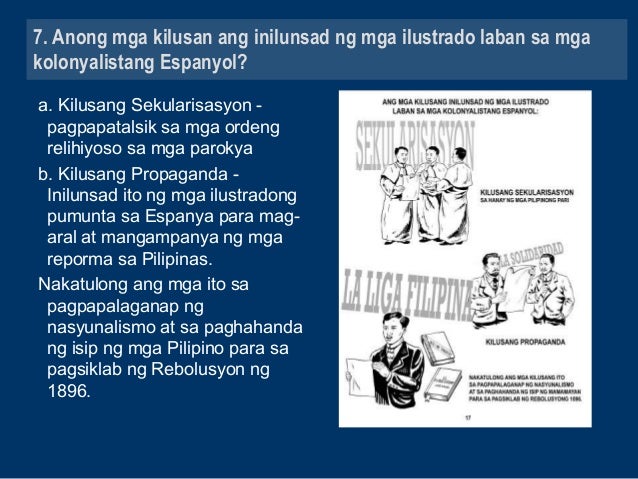 Gayundin ang kanilang mga bayani. Anong mga kilusan ang inilunsad ng mga ilustrado laban sa mga kolonyalistang Espanyol. Kilusang Propaganda - Inilunsad ito ng mga ilustradong pumunta sa Espanya para mag- aral at mangampanya ng mga reporma sa Pilipinas.